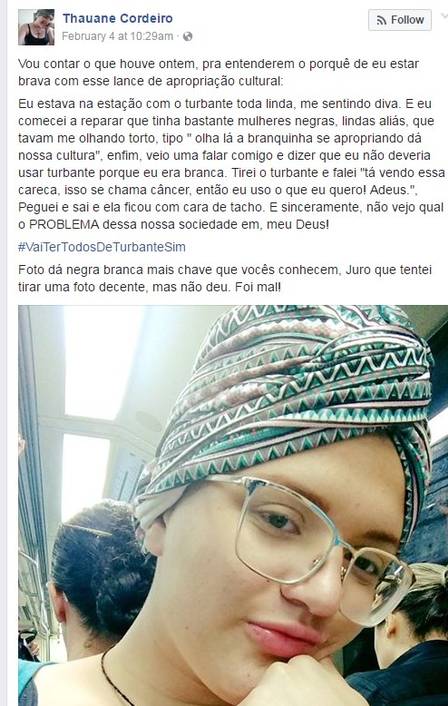 Esquerdismo é contradição ambulante. E agora temos mais um ótimo exemplo disso. Surgiu por aí esse papo ridículo de “apropriações culturais”, como se a cultura das “minorias” fosse propriedade delas, exclusiva, protegida dos malditos brancos opressores que vão lá e roubam detalhes aqui, detalhes acolá. A menina não pode usar turbante pois isso seria “apropriação cultural”? Ela deu uma boa resposta: