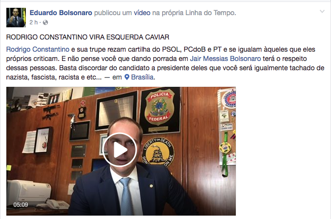O deputado, que tem se mostrado mais atuante nas redes sociais fazendo campanha para o pai do que no cargo político que ocupa com salário pago pelo povo trabalhador, gravou um vídeo em que me chama de esquerda caviar, dizendo que “minha trupe” (como se eu tivesse uma legião de seguidores fanáticos que dizem “amém” para um “guru”) age como o PSOL e o PT (sendo que foi seu pai que votou como o PSOL e o PT recentemente, vamos lembrar). Vejam: