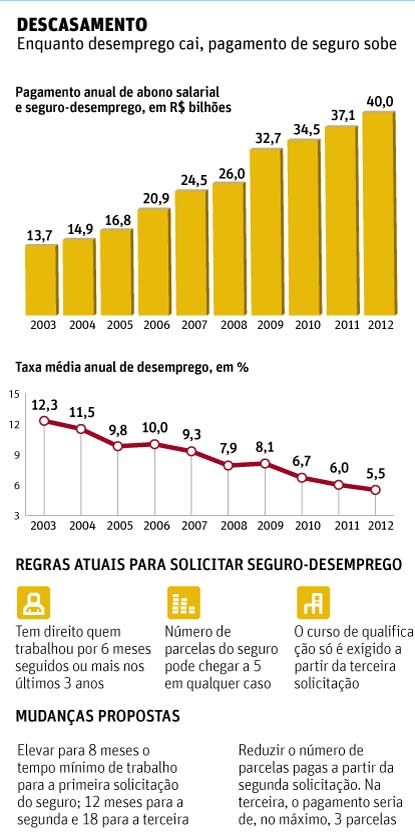 Em 2003, a taxa média anual de desemprego era de 12,3%, e as despesas com seguro e abono somavam R$ 13,7 bilhões. Em 2012, a taxa de pessoas sem trabalho caiu para 5,5%, mas o gasto subiu para R$ 40 bilhões.