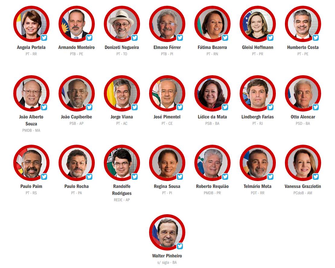 Mas não é por isso que vamos esquecer os 22 traidores da Pátria, os 22 senadores inimigos do povo brasileiro, que votaram para manter Dilma no poder, destruindo nossa economia, liderando uma quadrilha corrupta, gerando milhões de desempregados. São esses seus nomes. Anotem, gravem na memória, para nunca mais darem seu voto a essa gente: