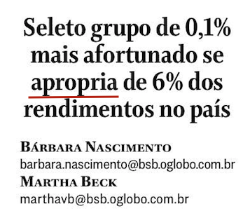 Nem vou falar do uso do termo “seleto”, tampouco de “afortunado”, como se fosse pura sorte, e sim focar no verbo utilizado: apropriar. Vejam só que coisa: os ricos se apropriam de parcela grande dos rendimentos no país. O que isso passa ao leitor leigo? A ideia de que os tais rendimentos caem do céu, brotam do solo ou são produzidos, como quer Obama, por todos, por um “coletivo”, uma massa monolítica, e que depois os mais ricos vão lá e metem a mão em 6% do bolo. Gulosos!