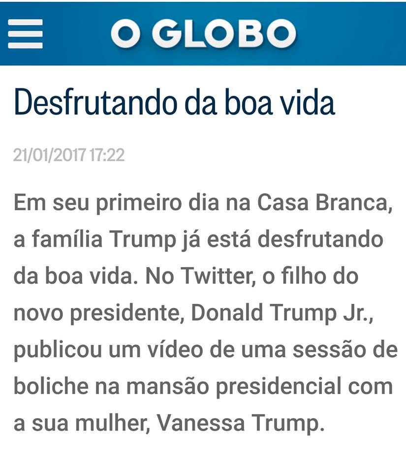 Alguém perguntou: “Será que antes da presidência o bilionário Trump só jogava boliche se juntasse 10 cabeças pra ratear a pista do Norteshopping?” Pois é. Só rindo mesmo. Não vamos esquecer que o próprio GLOBO sempre faz questão de chamar Trump de “bilionário”, frisando a situação financeira do novo presidente. O jornal nunca se referiu a Obama como o “milionário”, apesar de Barack Hussein ter uma fortuna estimada em $12 milhões.