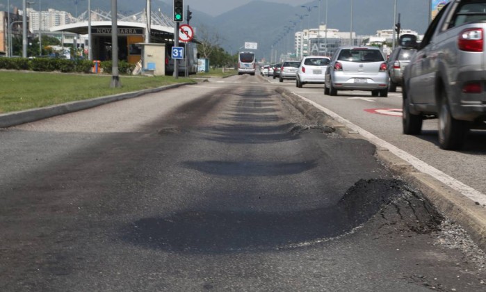 O funcionário diz que é só chover para o asfalto ceder ainda mais. Embora em Santa Cruz e Guaratiba as falhas sejam mais recorrentes, Recreio e Barra não estão livre de calombos e buracos.