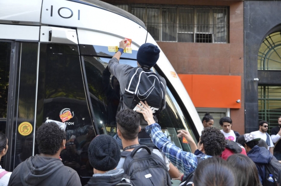 Um trem do VLT Carioca foi atacado por manifestantes que participavam de uma passeata de professores da rede estadual do Rio de Janeiro, na tarde desta quarta-feira, 22, no centro. O grupo pichou frases como “A greve continua”, “Dornelles, a culpa é sua” e “Não vai ter tocha” na lataria externa do veículo e colou dentro e fora dele dezenas de adesivos com referências à greve da categoria, iniciada em 2 de março. Ninguém foi detido. O veículo foi esvaziado e parou de circular.