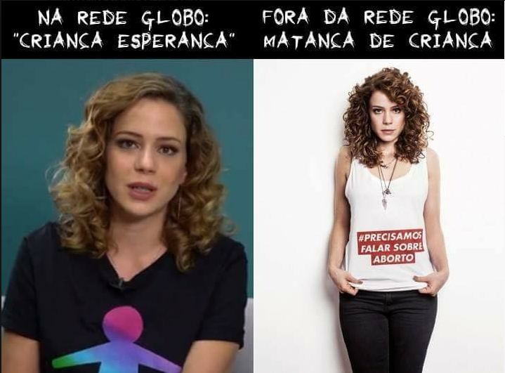Vou dar um exemplo bem pessoal para ilustrar o ponto. Minha filha adolescente compartilhou uma imagem que está circulando bastante pelas redes sociais, uma foto de Leandra Leal em que a atriz faz a campanha do “Criança Esperança” da Globo e depois aparece fazendo campanha pelo aborto. Eis a imagem: