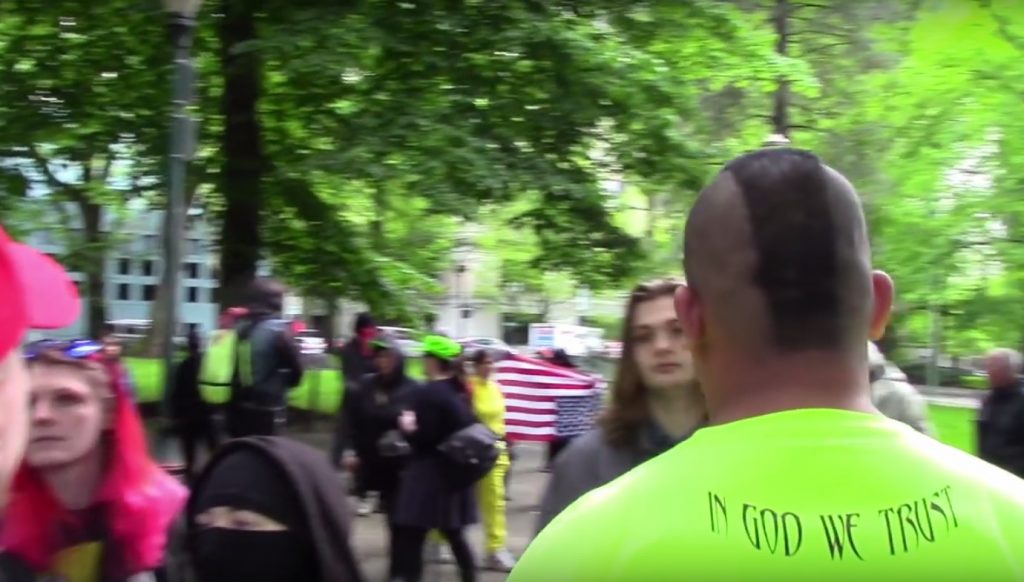 As coisas pareciam estar limitadas a uma guerra de palavras – isto é, até que um sujeito bastante grande, com uma camiseta amarela com a frase “In God We Trust” na parte de trás, tentasse passar pelos antifas.