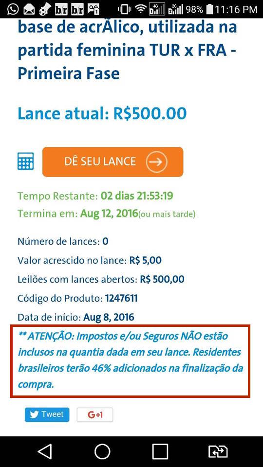 “ATENÇÃO: Impostos e/ou Seguros NÃO estão inclusos na quantia dada em seu lance. Residentes brasileiros terão 46% adicionados na finalização da compra.”