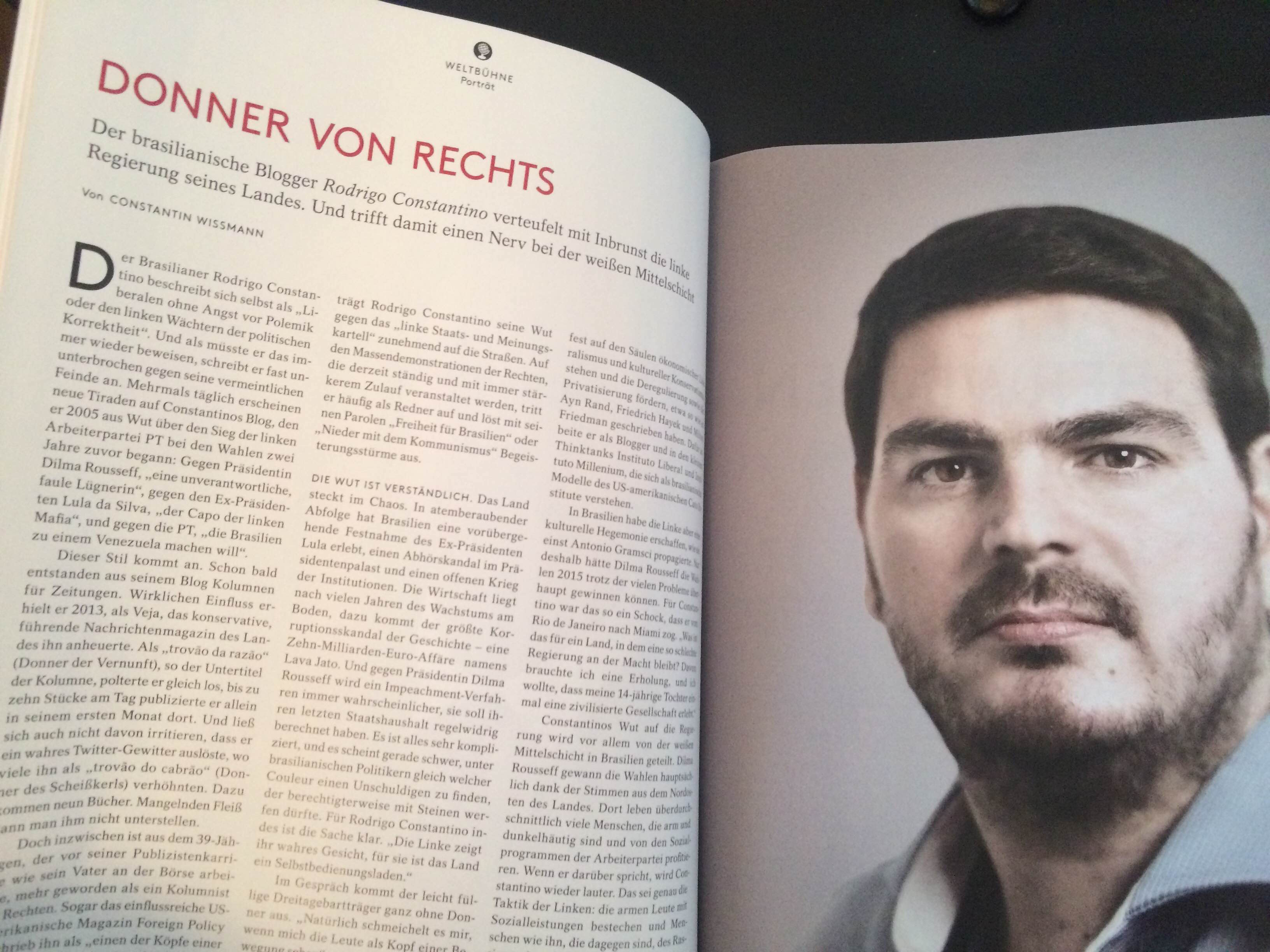 Publiquei aqui a matéria que saiu na revista alemã Cicero sobre mim. Eis que agora, graças ao favor de Beate Forbriger, diretora do Instituto Fredrich Naumann (grande parceiro dos movimentos pela liberdade no Brasil), e do excelente trabalho de Bernardo Fialho, da mesma entidade, meu leitor terá acesso ao conteúdo do perfil traçado pela revista.