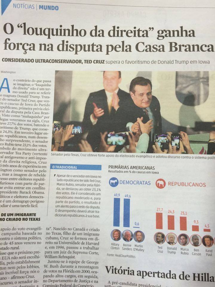 Não adianta usar aspas para se livrar da responsabilidade. O que esse jornalista fez foi lamentável. Ted Cruz é um advogado respeitado, com incrível currículo. Um senador texano admirado por sua boa gestão e um oposicionista combativo e firme do governo Obama, um dos piores das últimas décadas. Desqualificá-lo dessa forma é ridículo. Reduzi-lo a um “ultraconservador” e um “maluco religioso” é campanha difamatória da esquerda.