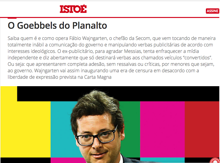Dito isso, essa batalha tende a produzir muito ruído ainda. Para atacar o secretário responsável pela Secom, o judeu Fábio Wajngarten, a revista IstoÉ publicou uma matéria de capa o chamando de Goebbels, líder nazista responsável pela propaganda de Hitler. O teor da reportagem também tem pitadas fortes antissemitas, o que revoltou a comunidade judaica.