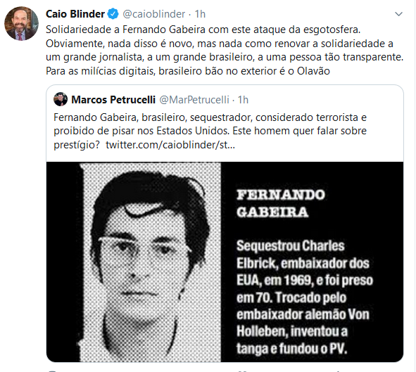 Concordo com Marcos Petrucelli nessa: em que pese sua evidente evolução, Gabeira tem pouca moral para falar da imagem de brasileiros no exterior, ele que sequestrou um embaixador americano quando jovem comuna. Caio Blinder acha lindo, como acha lindo o passado de "luta" da colega Miriam Leitão. Mas é uma mancha vergonhosa no currículo.