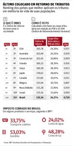 A conclusão consta de estudo do IBPT (Instituto Brasileiro de Planejamento e Tributação) que compara 30 países com maior carga tributária em relação ao PIB (Produto Interno Bruto) e verifica se o que é arrecadado por essas nações volta aos contribuintes em serviços de qualidade.