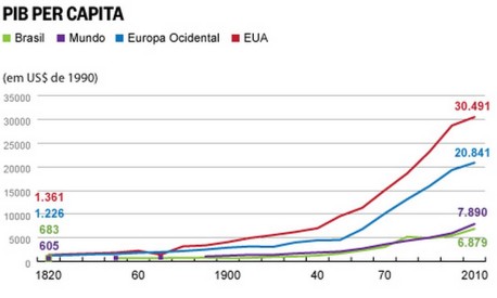 Não foi o que fez a reportagem do jornal O GLOBO. Com enorme destaque já no título, eis a mensagem que preferiu disseminar: Desigualdade entre países avançou no mundo entre 1820 e 2010, diz OCED. Embaixo, com letras bem menores, podemos ler: Qualidade de vida, no entanto, melhorou, aponta estudo da OCDE sobre 25 países entre 1820 e 2010.