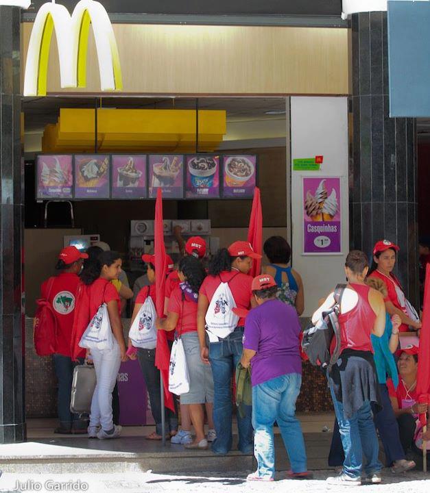 Essa coisa de fazer revolução socialista dá muito trabalho. E fome. Por isso que, após uma típica manifestação contra os imperialistas ianques e a exploração capitalista, podemos ver ativistas “sem-terra” fazendo um lanchinho em alguma cadeia capitalista multinacional qualquer. A foto da turma em fila no McDonald’s já é conhecida: