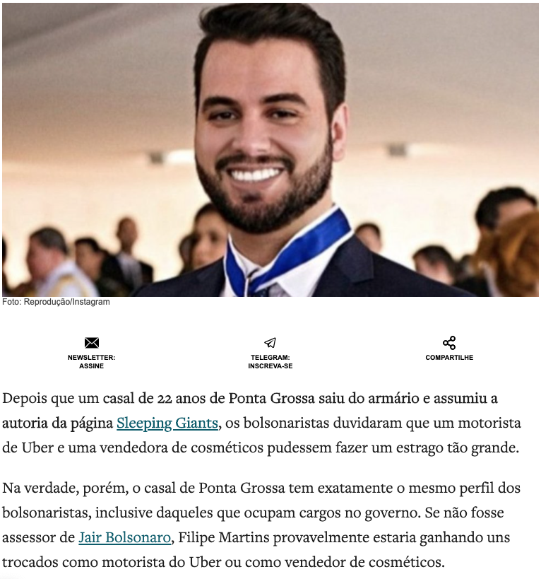 O que aconteceu com o terceiro membro? Quem é? Por que a Folha nada falou sobre isso? Cada vez tudo fica mais suspeito, e dão bandeira no esforço de entregar umas cabeças para preservar o anonimato e encerrar o assunto. Mas não colou! E olha que a Folha teve até ajuda dos "antas", que preferiram ridicularizar Filipe G. Martins por ele ter apontado uma das grandes falhas da narrativa inverossímil: motorista de Uber de esquerda?!