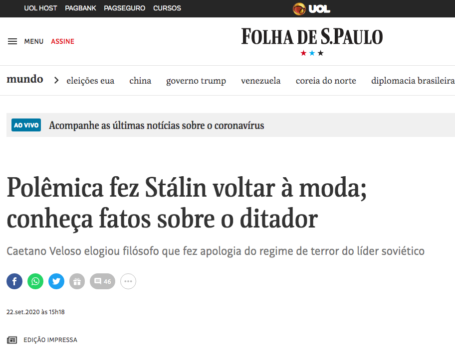 Dando uma navegada nas notícias de hoje para preparar a minha "live" já foi o suficiente para acumular diversos exemplos desse viés e da superioridade da narrativa sobre os fatos. Comecemos pelo caso mais patético: ninguém está preocupado com Stalin, tampouco o sanguinário ditador comunista está "na moda", mas a julgar pela Folha, esse é o grande debate do momento, como se houvesse realmente dúvidas acerta de quem foi o sujeito:
