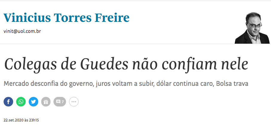 Aí vemos, no mesmo jornal, essa chamada do colunista, talvez no desespero da falta de uma boa pauta para atacar o governo, ignorando a lentidão do Congresso e as oscilações normais do mercado: