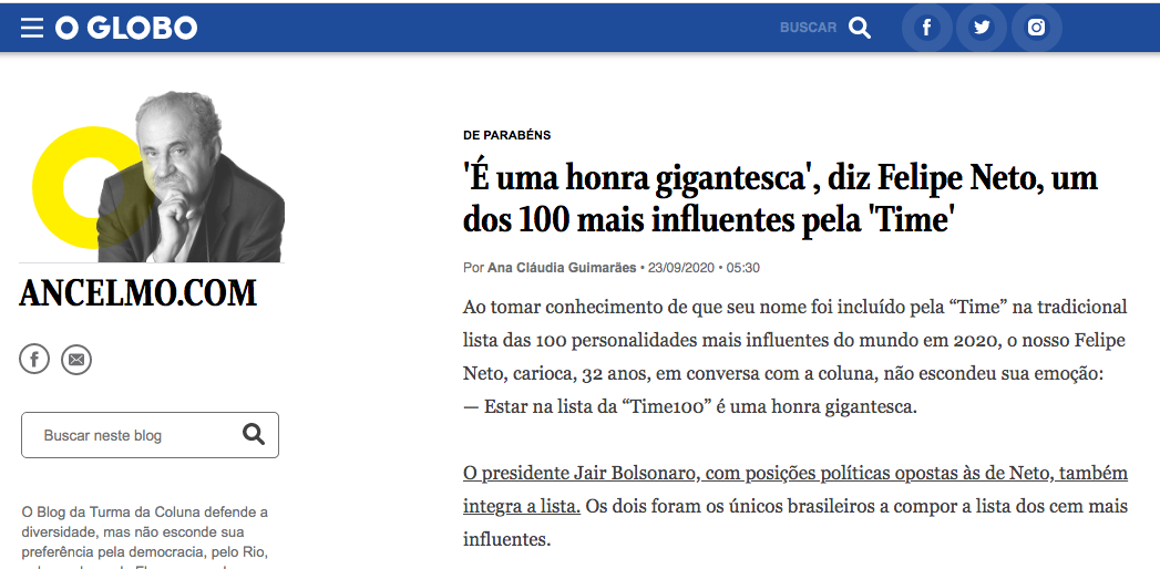 A mídia tenta também fabricar ícones. Um caso claro e recente é o de Felipe Neto, um youtuber que fez fama e fortuna ao imitar focas com o cabelo colorido, mirando num público infantil. O NYT publicou um vídeo seu atacando Bolsonaro, o Roda Viva o recebeu para uma entrevista, um ministro ativista do STF fez uma "live" com ele, o Fantástico realizou uma reportagem longa sobre o rapaz, e agora a revista "Time" o colocou como uma das cem pessoas mais influentes do mundo: