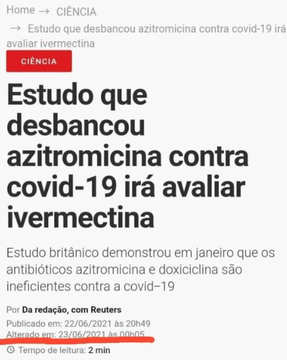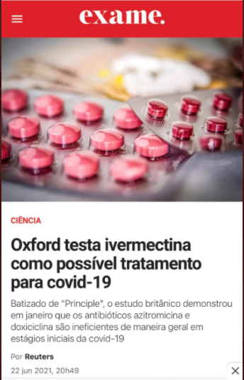 Pode ser que o troço seja placebo? Até pode, mas há indícios de que não é este o caso. Não obstante, jornalistas arrogantes e ignorantes adotam narrativas imbecis, tudo para atingir Bolsonaro, e o fazem em nome da ciência. É de arrepiar! Aí nos deparamos com a notícia de que Oxford está realizando testes para a ivermectina. A revista Exame deu a notícia de forma normal antes, depois apagou e passou pelo filtro do lacre: