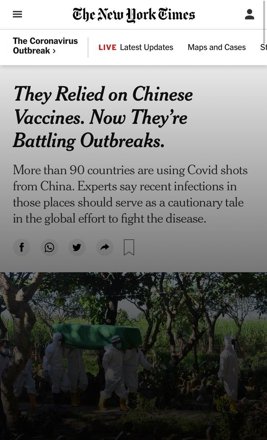 Já no insuspeito New York Times, jornal esquerdista, há uma reportagem mostrando que vários países apostaram na vacina chinesa e agora enfrentam surtos de Covid:
