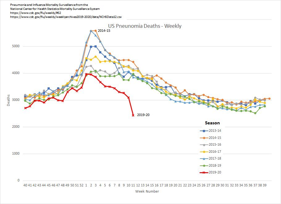 Esse gráfico acima tem gerado controvérsias. Alguns alegam que as mortes normais de pneumonia foram transferidas para o covid-19, outros argumentam que, mesmo admitindo essa transferência, a pandemia atual já matou mais de 5 mil pessoas em excesso ao que morria de influenza. Ainda assim fica claro que a forma de computar as mortes faz diferença, e há um clima de histeria no ar.