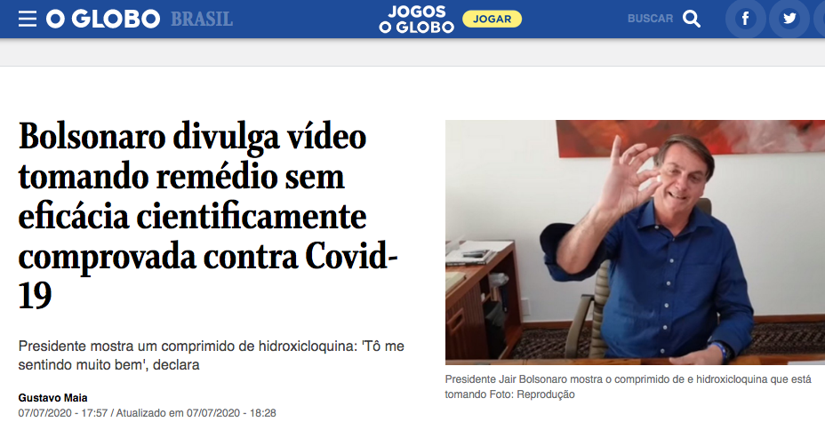 Vejam esse outro exemplo. O grupo que fez uma reportagem sobre a cloroquina durante o surto da zika, recomendando que seu uso era seguro até para mulheres grávidas, agora sequer pode mencionar o nome do remédio na chamada, e destaca a falta de "comprovação científica" mesmo com inúmeros médicos o recomendando por estarmos numa pandemia, o que permite relaxar certos protocolos: