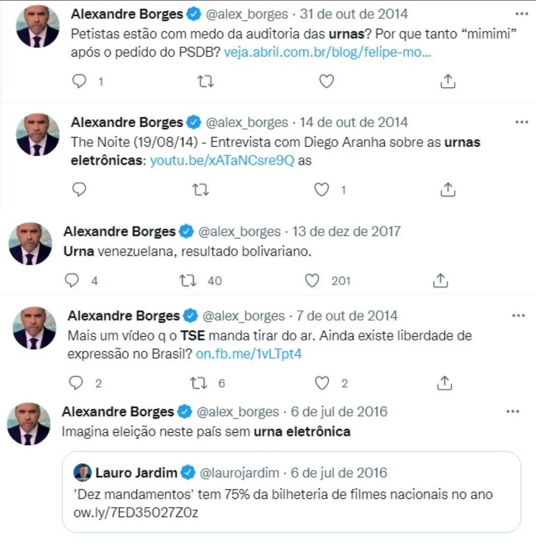 Outra influência foi minha querida amiga Joice. A então deputada federal Joice Hasselmann já atacou o STF e ficou impune, o que acabou estimulando uma sensação de "liberou geral" em mim. Alexandre Frota também pegou pesado com os "homens de capa preta que não mereciam estar lá", referindo-se aos ilustres ministros do STF. Outro Alexandre, o Borges, colocou em xeque as urnas em várias mensagens: