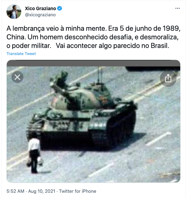 Os partidos de extrema esquerda chegaram a acionar o tapetão supremo para impedir um simples desfile, mas dessa vez nem o ex-advogado do PT sucumbiu. Era patético demais o pedido! O que não impediu cada petista e tucano de exalar falsa virtude democrática nas redes. A esquerda não vive sem um fascismo imaginário para combater! Foi o caso do tucano Xico Graziano, que resgatou a icônica imagem do indivíduo chinês parando uma fila de tanques no massacre da Paz Celestial: