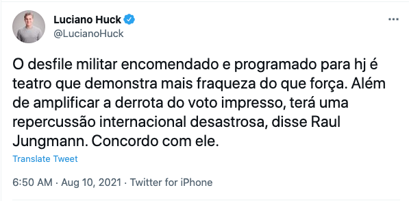 Mas a oposição ao governo foi à Justiça querendo impedir o que eles estão chamando de "desfile militar de atemorização" para a votação. Ninguém olha o calendário e vê que isso aí é uma coisa que já estava prevista, que não tem nem condição de um blindado vir do Rio de Janeiro de um dia para o outro. É um completo absurdo.