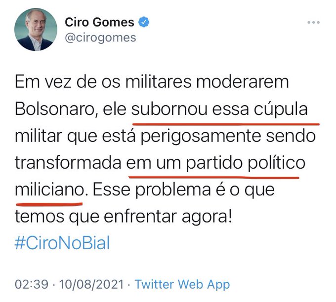 Já Ciro Gomes, cujo PDT recebe grana do Partido Comunista Chinês, fez o de sempre: acusações bizarras e levianas. O candidato da Nova Esquerda, o queridinho do MBL, disse que as Forças Armadas foram "subornadas" e as chamou de "partido político miliciano". Mas isso tudo bem, pois vem da esquerda!