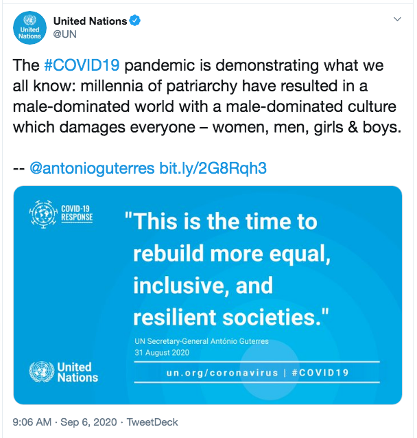 Eles não fazem mais questão de esconder que são um lixo esquerdopata autoritário. ONU postando, em sua conta oficial, que a epidemia mostrou como milênios de "patriarcado" resultou em domínio dos homens, numa cultura que prejudica a todos. E você achando que era sobre saúde...