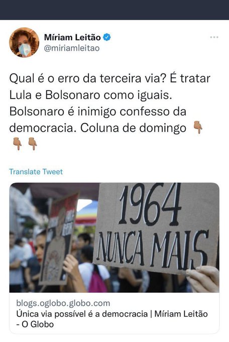 Miriam Leitão, a "respeitada" jornalista, escreveu uma coluna no fim de semana apontando o que enxerga como grande equívoco da terceira via: atribuir uma equivalência entre os dois "extremos". Até aí, estamos de acordo. Mas aí vem a revelação, para a surpresa de ninguém: Miriam está dizendo que Bolsonaro é muito pior, pois não respeita a democracia, enquanto o outro lado seria "democrata".
