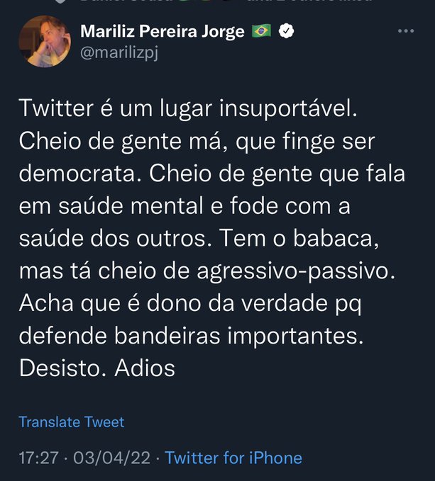 "Twitter é um lugar insuportável. Cheio de gente má, que finge ser democrata. Cheio de gente que fala em saúde mental e fode com a saúde dos outros. Tem o babaca, mas tá cheio de agressivo-passivo. Acha que é dono da verdade pq defende bandeiras importantes. Desisto. Adios"