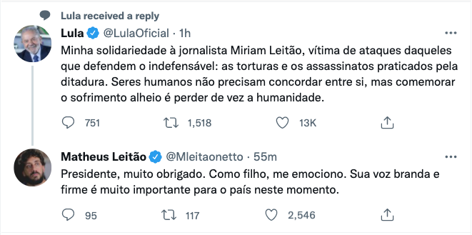 Nem mesmo o ladrão conseguiu se conter. Dando muita bandeira, deixando claro a orquestra da coisa toda, o próprio Lula, um ilustre humanista, veio demonstrar repúdio aos "ataques" contra a jornalista, apenas para ter o reconhecimento do "nobre gesto" pela própria jornalista e também seu filho, o comunista que já declarou voto em Lula: