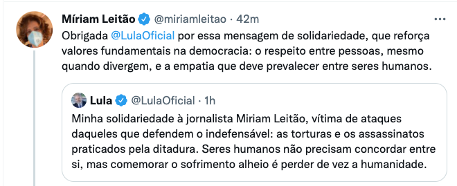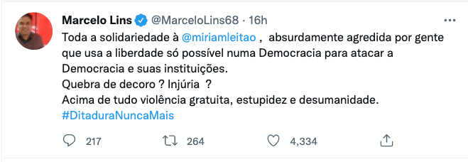 O coleguinha da GloboNews, defensor do Psol, também aproveitou para divulgar o discursinho manjado da turma: "Toda a solidariedade à Miriam Leitão, absurdamente agredida por gente que usa a liberdade só possível numa Democracia para atacar a Democracia e suas instituições. Quebra de decoro? Injúria? Acima de tudo violência gratuita, estupidez e desumanidade. #DitaduraNuncaMais"