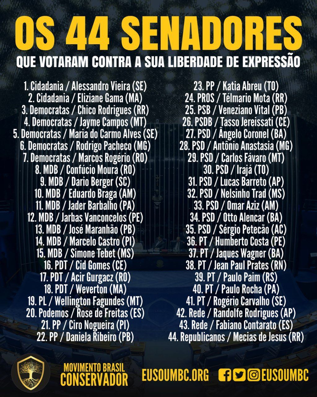 Para facilitar, eis a lista toda dos senadores que votaram pela censura: