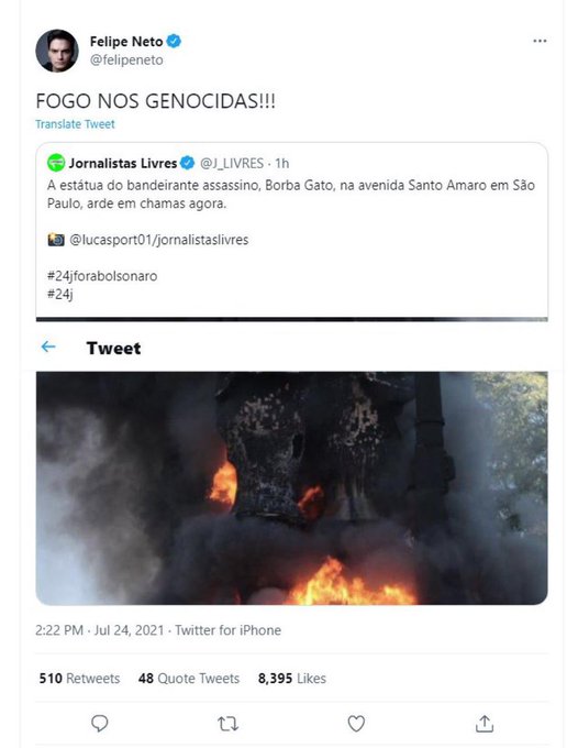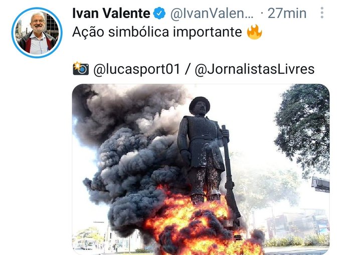 Ganhou as redes sociais este fim de semana a cena da estátua de Borba Gato em chamas. O ato terrorista foi realizado por um grupo que se chama Revolução Periférica, que assumiu a autoria. A faixa estendida em frente ao ato dizia: "A favela vai descer e não vai ser carnaval".