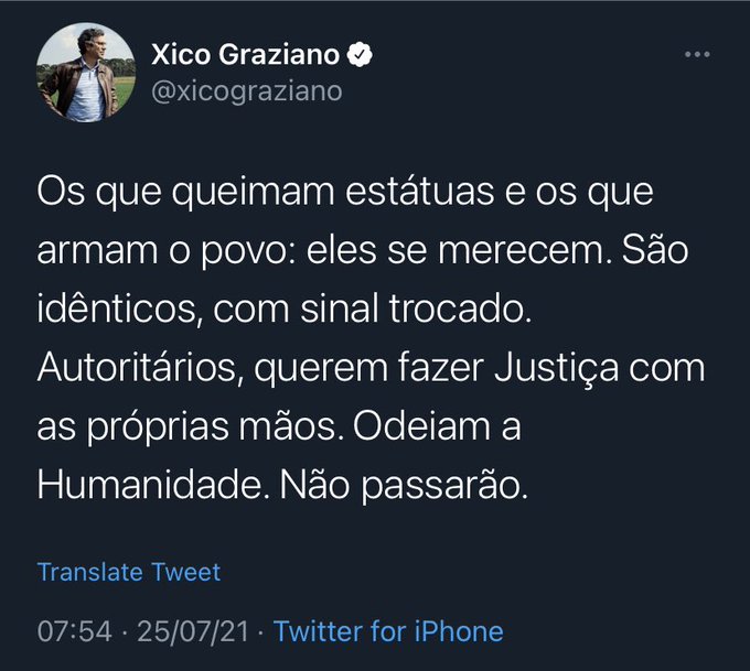O jogo é bruto, companheiro. E se a direita não fizer sua parte na resistência contra a verdadeira ameaça fascista, então o prognóstico do nosso futuro não será dos melhores. Hoje eles queimam estátuas; amanhã poderão queimar pessoas.