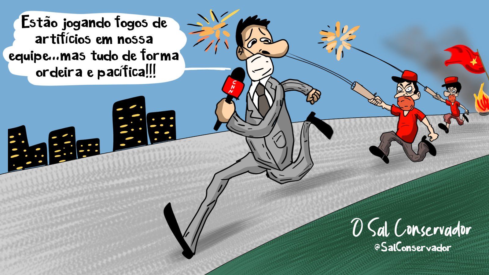 Mas, assim como a CNN americana passou vergonha ao falar em atos pacíficos dos Black Lives Matter enquanto a imagem atrás negava a narrativa, com tudo em chamas, a CNN Brasil foi pelo mesmo caminho e criou os "pacifistas que jogam fogos de artifício nos jornalistas", tudo de maneira ordeira e tranquila: