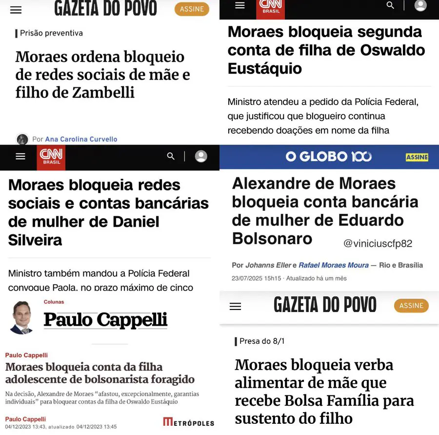 A ironia mostra bem o grau de abuso praticado pelo próprio ministro e seus cúmplices. A choradeira por afetar a família do ministro ignora o que ele próprio já fez. Vale refrescar a memória: "Moraes ordena bloqueio de redes sociais de mãe e filho de Zambelli"; "Moraes bloqueia redes sociais e contas bancárias de mulher de Daniel Silveira"; "Moraes bloqueia conta da filha adolescente de bolsonarista foragido"; "Moraes bloqueia segunda conta de filha de Oswaldo Eustáquio"; "Alexandre de Moraes bloqueia conta bancária de mulher de Eduardo Bolsonaro".