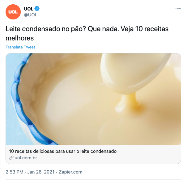 E por falar nessa velha imprensa... Essa obsessão por demonizar Bolsonaro será a pá de cal na credibilidade da mídia nacional. Eis o que o UOL, da Folha, resolveu fazer, para lacrar com seu público, sabendo que o presidente gosta de usar o leite condensado no pão: apresentou receitas melhores para o uso do leite condensado, uma sutileza de um elefante numa loja de porcelana.