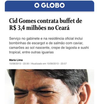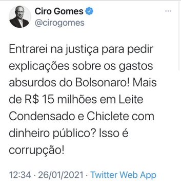 Mas por falar em canalhice... ela vem de parte da imprensa e dos políticos, claro. Foi o caso de Ciro Gomes, que prometeu até entrar na Justiça para pedir explicações sobre os "gastos absurdos" do Bolsonaro (novamente associando ao presidente, não ao governo todo), ignorando que seu irmão gastou R$ 3,4 milhões em buffet no Ceará quando governador. Memória curta, né!