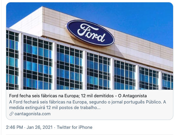 A verdade é que a oposição ao governo anda perdida e tentando culpar o presidente por tudo de ruim que acontece. Como a atriz esquerdista Jane Fonda confessou nos Estados Unidos, a pandemia foi um "presente de Deus" para essa turma inescrupulosa. A Ford anuncia fechamento de fábrica no Brasil? Então é culpa de Bolsonaro, mesmo que a montadora faça o mesmo no mundo todo! Falta oxigênio em Manaus, no Amazonas, onde o "covidão" chegou com força e a secretária de Saúde foi até presa? Culpa de Bolsonaro, mesmo que falte oxigênio em vários hospitais... em Portugal!