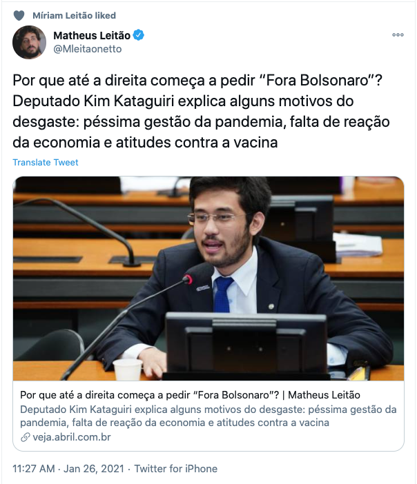 Leandro Ruschel também descascou o filho da Miriam Leitão: "Se fosse um jornalista, e não mais um militante de redação que tomou as dores da mãe, o que é até compreensível, saberia que: 1) Não integram a direita. 2) Estão em campanha contra o presidente desde logo após a posse". Mas não importam os fatos, só a narrativa, e esta é que até a "direita" estaria abandonando o governo agora, de tão nefasto que ele é.