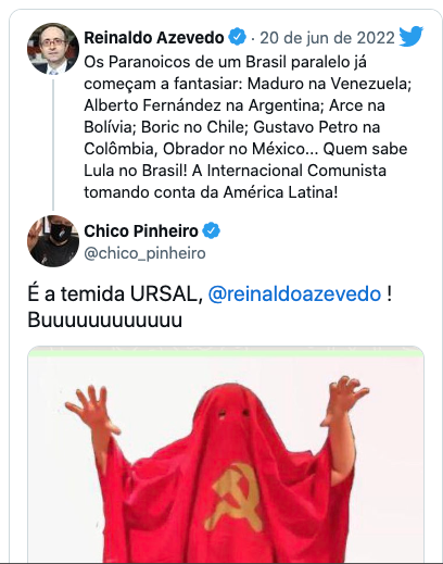 Reinaldo Azevedo, que ninguém mais reconhece como o autor de O País dos Petralhas, tentou ridicularizar o temor, mas acabou listando justamente países que estão no ou caminham para o inferno socialista: "Os Paranoicos de um Brasil paralelo já começam a fantasiar: Maduro na Venezuela; Alberto Fernández na Argentina; Arce na Bolívia; Boric no Chile; Gustavo Petro na Colômbia, Obrador no México... Quem sabe Lula no Brasil! A Internacional Comunista tomando conta da América Latina!"