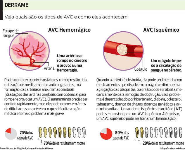 De acordo com os médicos, existem dois tipos de AVCs (ver quadro), o hemorrágico como o sofrido pelo técnico do Vasco Ricardo Gomes, no final do mês de agosto , e o isquêmico. "Nas duas situações não há sangue novo para nutrir os tecidos cerebrais", explica Gagliardi.