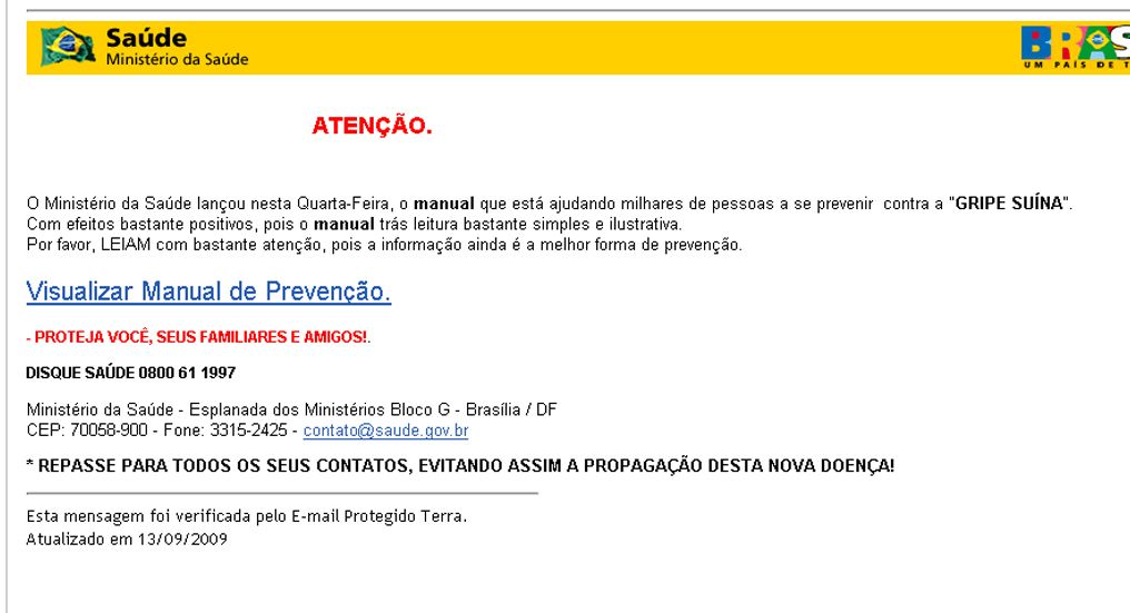 O e-mail pede que o internauta clique em um link chamado "Visualizar Manual de Prevenção", que quando acessado ataca o computador do usuário com vírus. Nem o ministério, nem a secretaria não passam informações por e-mail.