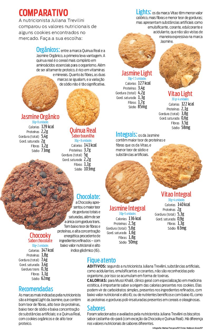 Caseiros ou industrializados, os cookies (do inglês, bolacha) são indicados por nutricionistas como complemento alimentar ideal nos intervalos das refeições. "Os mais recomendados são os que levam ingredientes integrais, açúcar mascavo, frutas secas e oleaginosas, como castanhas e amêndoas", diz a nutricionista Juliana Trevilini. Ela explica que muitas marcas adotaram o conceito saudável em suas receitas para se adequarem à crescente demanda dos consumidores por produtos mais nutritivos. "Em geral, os cookies são ricos em vitaminas e sais minerais (como ferro, ácido fólico e selênio), e têm carboidratos de baixo índice glicêmico (IG), o que torna mais lenta a absorção de glicose no sangue. Também contêm proteínas de origem vegetal derivadas dos cereais", explica.