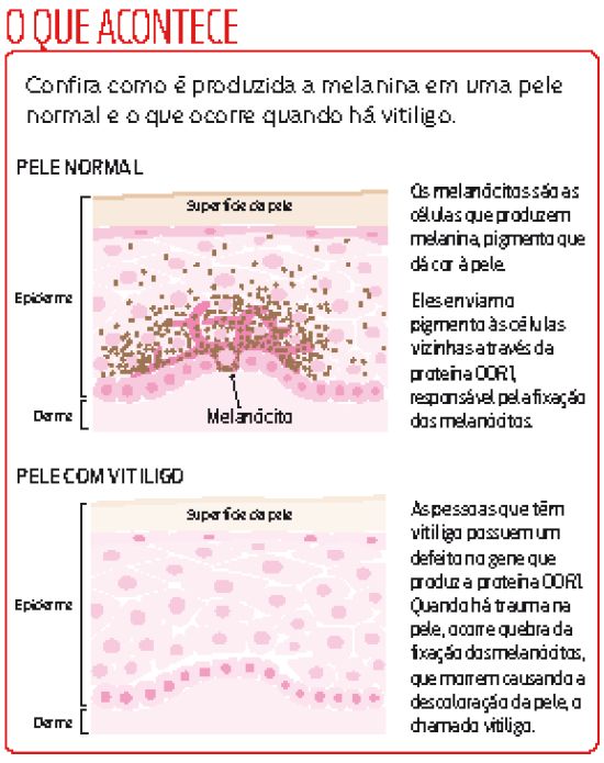 "Descobrimos que a maioria das pessoas que tem vitiligo possui um defeito no gene que produz a proteína DDR1. Essa proteína é responsável pela fixação dos melanócitos (células de pigmentação). Se a ligação é rompida, essas células morrem e a pele perde sua coloração", explica ele, que é especialista em doenças de pele. No estudo foram analisadas amostras de sangue de 638 pessoas portadoras e não portadoras da doença.