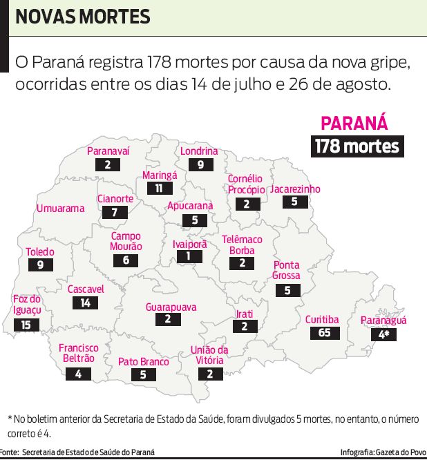 A Secretaria de Estado da Saúde (Sesa) confirmou ontem mais nove mortes por causa da gripe A no Paraná. O número total de óbitos no estado chegou a 178. Isso porque a Sesa corrigiu o número de mortes divulgado no boletim anterior. Eram 169 óbitos e não 170, como foi anunciado pela secretaria na quarta-feira.